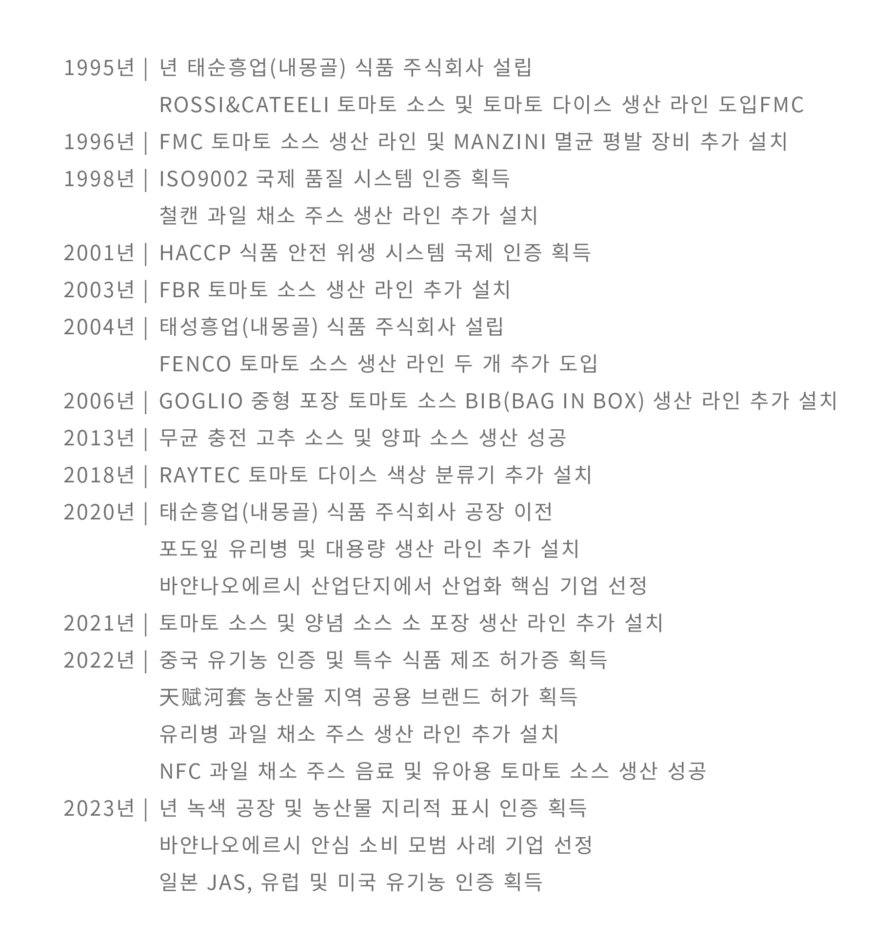 태순흥업(내몽골) 식품 주식회사는 1995년에 설립되었으며, 내몽골 바얀나오에르 시에서 처음으로 설립된 외국 투자 기업이자 25년이상 지속적으로 생산을 이어가고 있는 내몽골에서 유일한 토마토 가공 기업입니다. 현재 내몽골에서 세개의 가공 공장을 운영하고 있으며, 총 투자액은 4350만달러(약 30억 위안)에이르고, 연간 생산가치는 2750만 달러(약 20억 위안)입니다. 주요 제품으로는 토마토, 고추, 양파, 포도잎 등 다양한 우수 농산물을 가공 생산하며, 연간 가공 제품은약 2만 8000톤에 달하며, 주요 수출 국가 및 지역으로는 일본, 한국, 동남아시아, 중동, 유럽및 미주 국가 등이 있습니다.